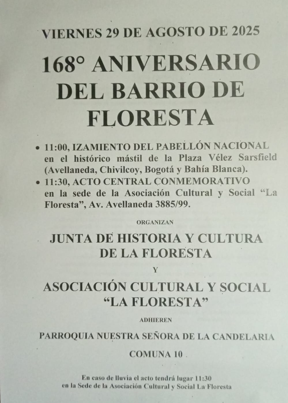 El acto central conmemorativo, por los 168 años de Floresta La Bocina 26 de agosto de 2025 Relacionado Post navigation Previous: Según el gobierno, el motín en la Alcaidía de Parque Avellaneda “está controlado”Next: All Boys empató como local, frente a San Martín tucumano NOTAS RELACIONADAS Ernestito Montiel y su Cuarteto Santa Ana, en el Parque Centenario La Bocina 27 de enero de 2026 0 Juegos de agua, inflables, deportes, cine al aire libre y más, en el Parque de la Ciudad La Bocina 26 de enero de 2026 0 “Piazzolla eterno”: la vida y la música del gran Ástor, en el Teatro Colón La Bocina 24 de enero de 2026 0
