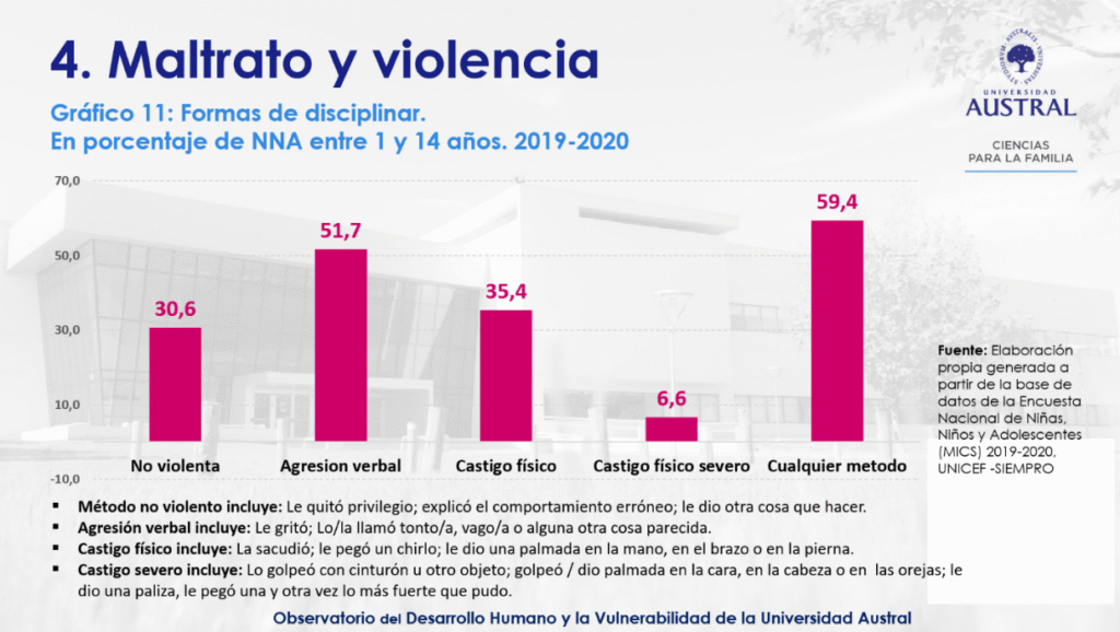 Uno de los datos más alarmantes del informe es que el 35,4 % de los niños entre 1 y 14 años ha recibido castigo físico como método de disciplina, mientras que un 6,6 % ha sido víctima de castigos físicos severos, como golpes con objetos o palizas. Estas cifras surgen de la Encuesta Nacional de Niñas, Niños y Adolescentes (MICS 2019-2020), elaborada por UNICEF y SIEMPRO, y reflejan una realidad que vulnera gravemente los derechos consagrados en la Convención sobre los Derechos del Niño. El informe también destaca que más del 50 % de los niños ha sido objeto de agresiones verbales, y que solo el 30,6 % recibe métodos de disciplina no violentos, como explicaciones o redirección de conducta.