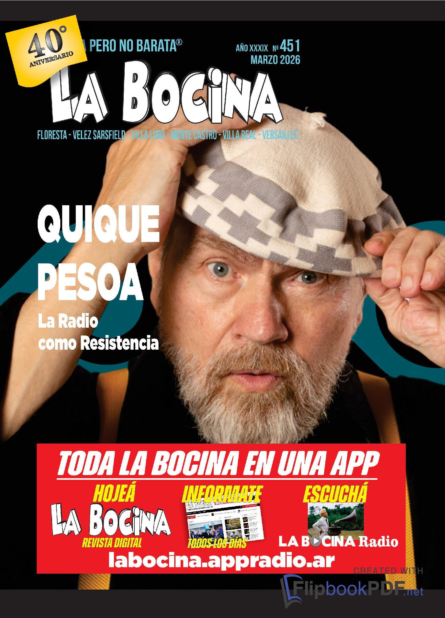 La Bocina N° 451 – Marzo 2026 La Bocina 17 de marzo de 2026 1 minute read HAGA CLICK EN LA TAPA PARA HOJEAR LA REVISTA OTRAS EDICIONES DE LA BOCINA EN VERSIÓN DIGITAL Relacionado Post navigation Previous: Luciano Cáceres: “los políticos deben pagar si hacen algo mal” NOTAS RELACIONADAS La Bocina N° 450 – Febrero 2026 La Bocina 21 de febrero de 2026 0 La Bocina N° 449 – Enero 2026 La Bocina 25 de enero de 2026 0 La Bocina N° 448 – Diciembre 2025 La Bocina 17 de diciembre de 2025 0